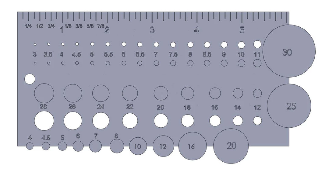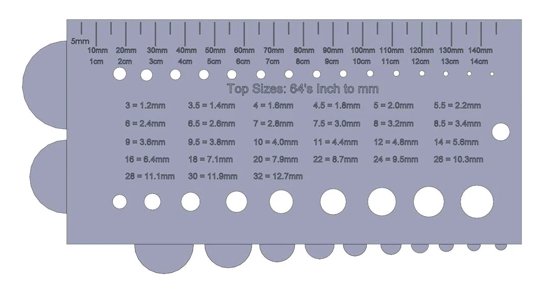 - CRB-exclusive conversion chart imprinted on the back showing MM to 64ths conversion. Range from 3/64″ (1.2mm) to 32/64″ (12.7mm)