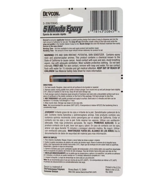 Devcon’s exclusive applicator features a patent pending design that makes it easy to dispense and mix the right amount of adhesive for any job. The snap off cap eliminates unsafe cutting of the tube ends while the snap out paddle in the handle makes it easy to mix. The nozzle design lets even the thickest materials to flow easily. Devcon is the easy choice!