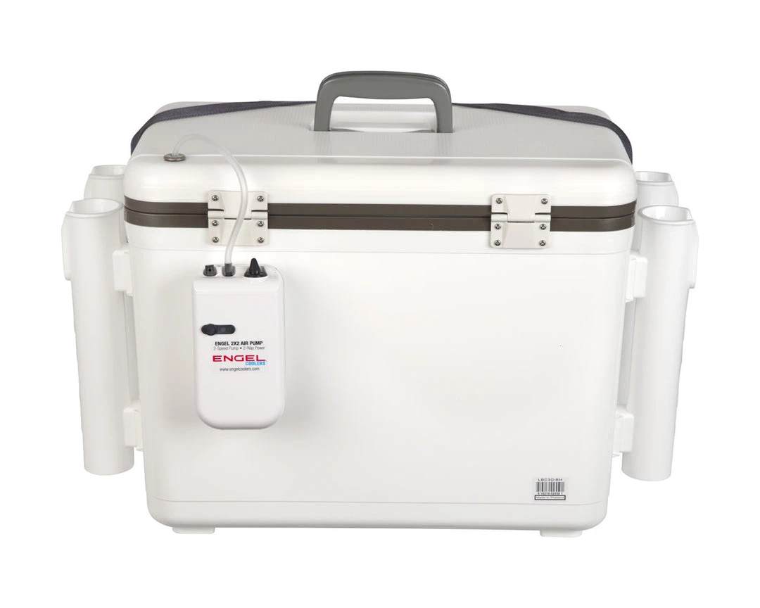 How could we improve upon a wildly popular industry standard? Well, we listened to our customer’s feedback and implemented two important changes. First, we replaced the standard “hang tray” with an all-new pull net. This new feature makes fetching your bait and changing water a breeze‰Û_and it’s designed to withstand wear and corrosion. Second, we moved the air tube port from the edge of the sidewall up into the lid. This should allow you to fill/use more of the box capacity, while also cutting down on the small overflow splashes that result from allowing the cooler to vent around the air tube. Our powerful 2-speed 2X2 Air Pump keeps the water fully aerated, while the insulated cooler shields expensive bait from extreme temperatures. Plug into your car or boat’s cigarette lighter using 12V adapter to run the pump overnight and keep bait fresh for the next morning.