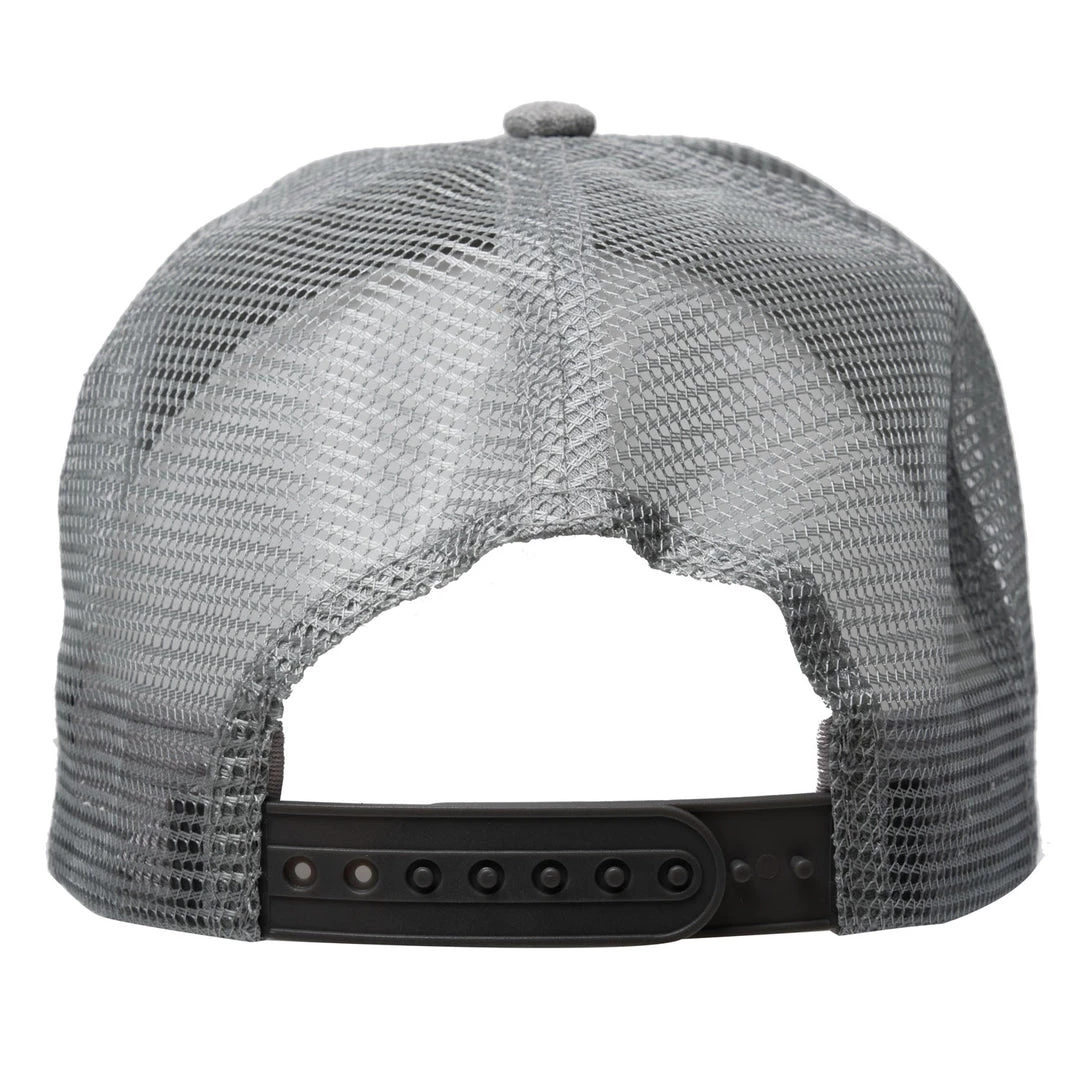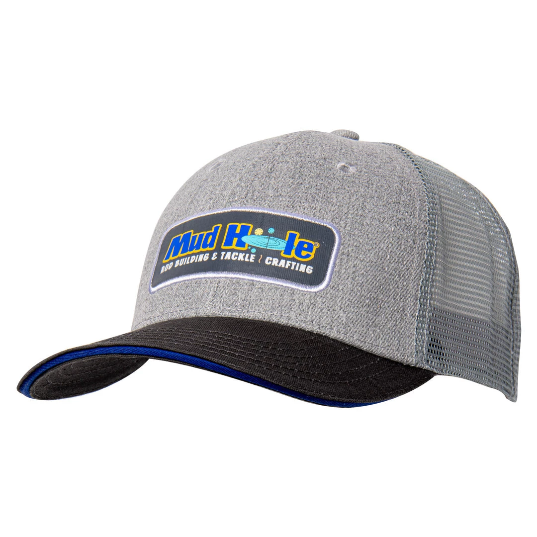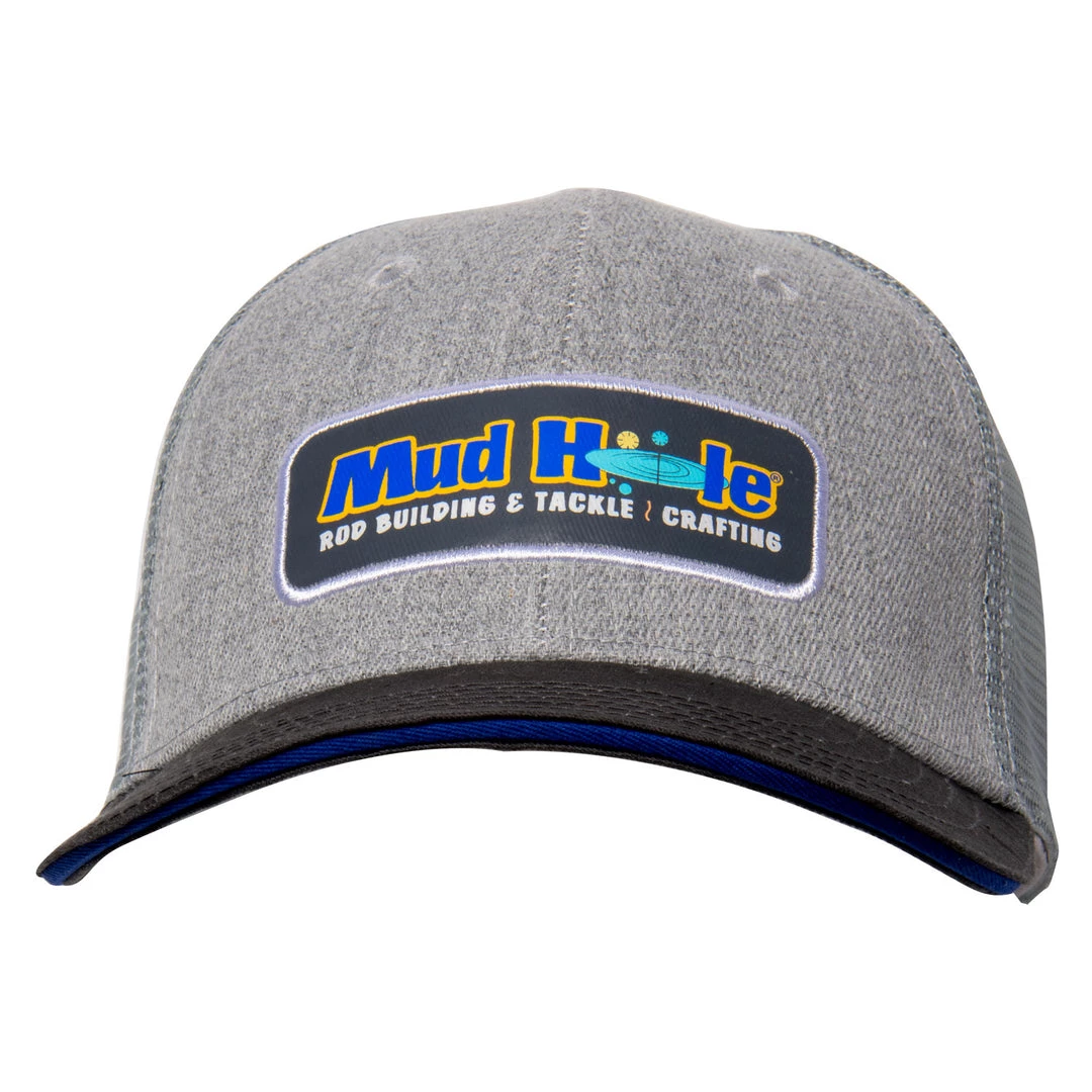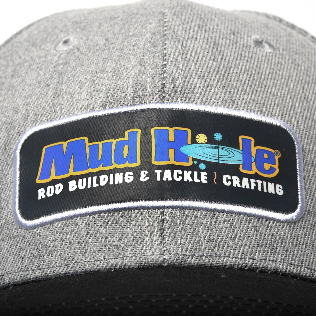 This trucker style snapback hat features a mid-rise crown with a Mud Hole vinyl printed patch sewn onto a heather gray buckram-fused front panel for a structured cap that keeps its shape. The stylish sandwich bill includes a black topside, a “Mud Hole” blue accent, and a black underside that cuts down glare when fishing.