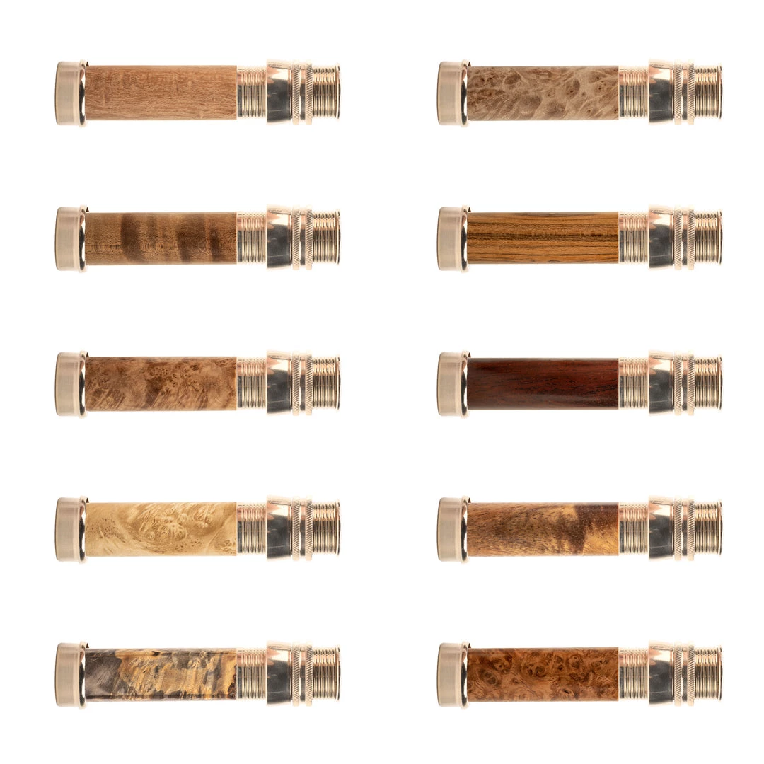 | Color | Birdseye Maple, Tiger/Fiddleback Maple, Box Elder Burl, CA Buckeye Burl, Stabilized Maple Burl, Bocote, Cocobolo, Curly Koa |