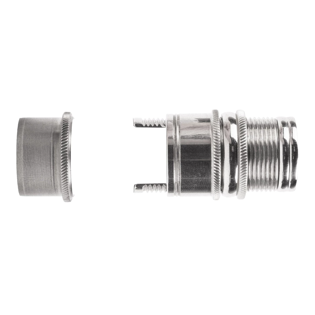 Our “signature” seat. Uplocking design with skeleton barrel featuring a trim band, special butt cap, knurled nut, knurled slide band with fine trim lines, and knurled fixed hood. Recommended for #5-8 line weight rods. Fits insert #1128, sold separately.
